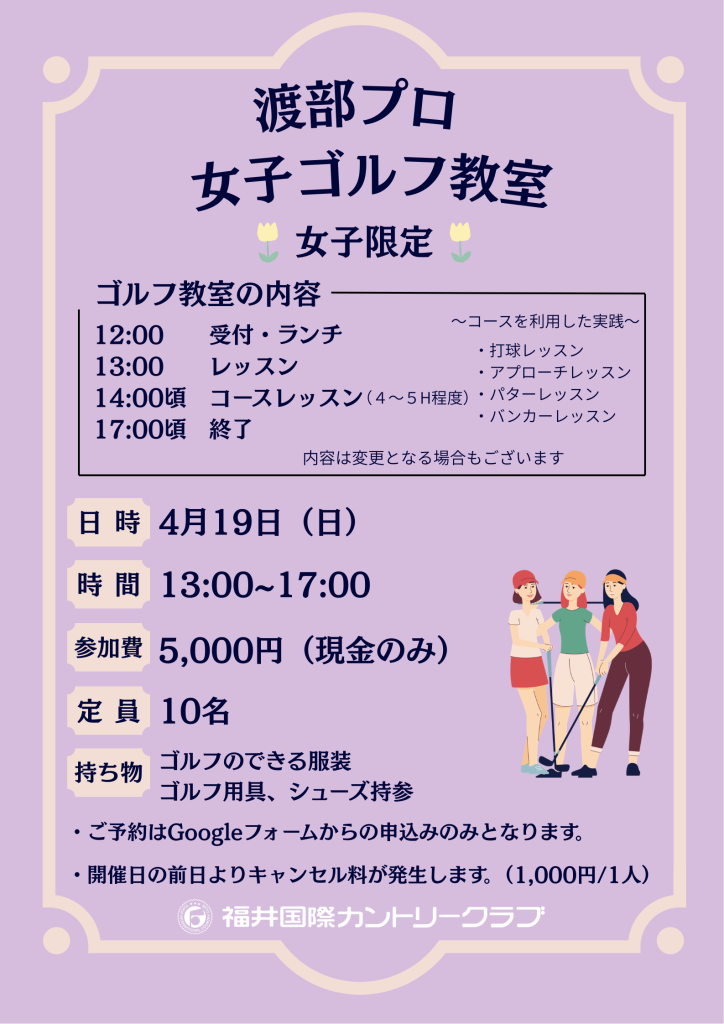 4月19日(日)開催の『女子ゴルフ教室』、本日(3月19日・12時より)ご予約の受付を開始します!